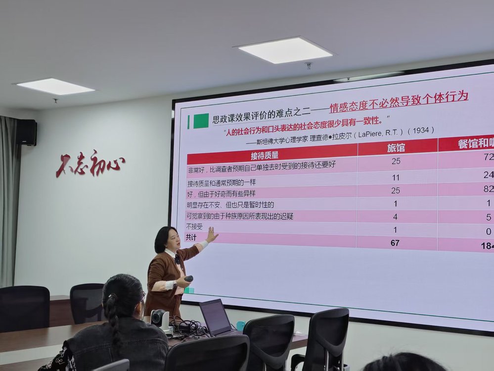 王郢教授以协助一线老师对思政课程进行评价为抓手,围绕思政课评价难点、整体评价方案的设计与撰写两个要点展开本期讲座。针对思政课落脚点难以衡量的内隐要素的问题、思政课是否可以被评价这一问题、持怀疑态度、态度形成的长时性与评价的即时性矛盾问题、营造情境的复杂性与评价方法的简洁性矛盾问题等,王郢教授以拉皮尔的态度行为一致性试验为例,点出了这些现象不仅仅出现在教学一线,也出现在社会心理学等理论研究领域。王郢教授指出,思政课教学评价具备可操性的同时也存在较大难度,评价需基于情境、基于认知、基于真实同时也需分类进行,要善用多源互证和元评价,同时运用海量的案例讲解了微观评价指标和评价维度的设计。王郢在报告中分享了方案设计中的个人经验,即要注意评价方案设计中的人才培养特征表达和情境任务设计。