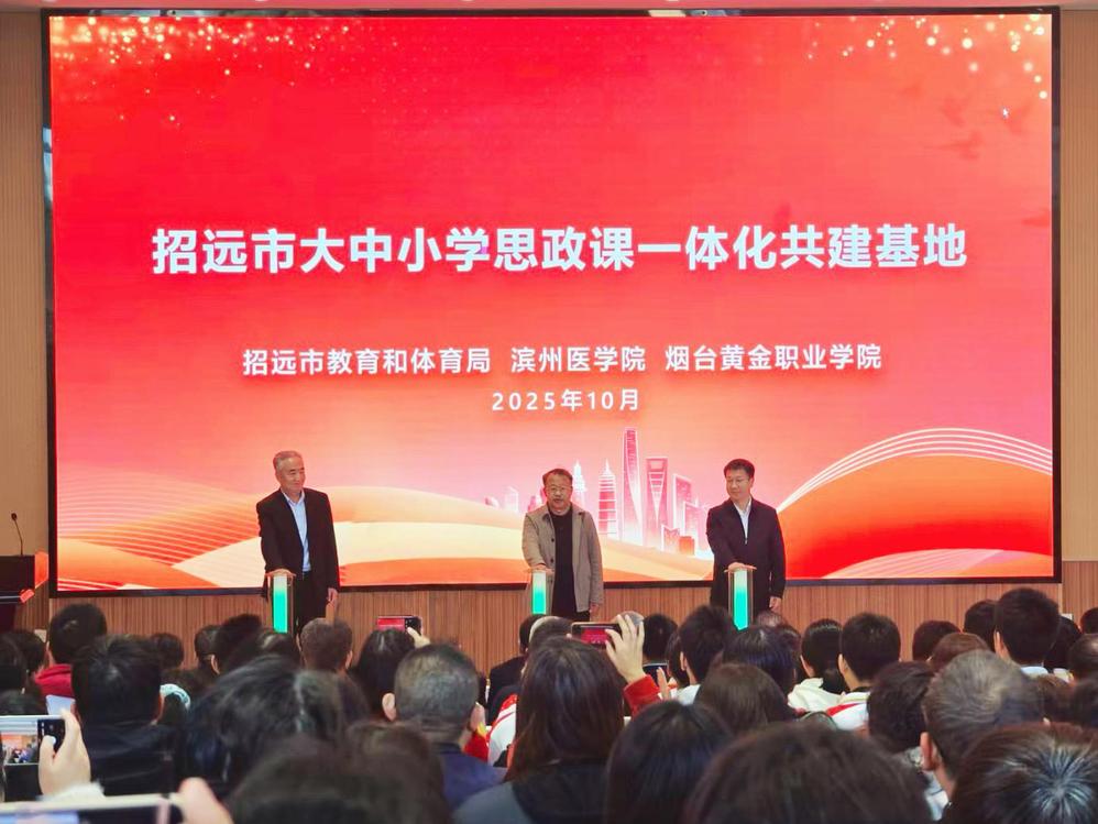 10月31日上午,学校联合烟台黄金职业学院与招远市教育和体育局共建大中小学思政课一体化基地揭牌活动在山东省招远第一中学举行。校党委副书记于景科,烟台黄金职业学院党委书记王广成,校党委委员、宣传部部长顾玉春,烟台市委教育工委副书记、市教育局党组成员、副局长王诗龙,招远市委教育工委常务副书记、市教育和体育局党组书记、局长滕希田出席活动并分别致辞,共同见证共建基地落地。
