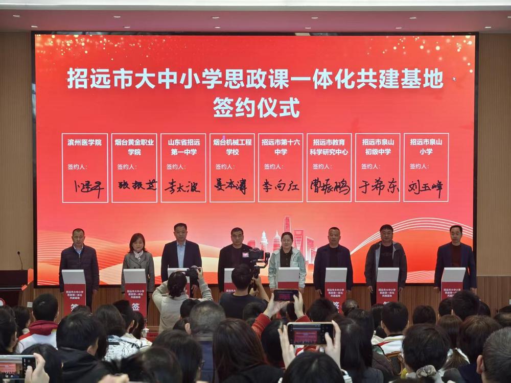 活动现场,于景科与王广成、滕希田共同为“招远市大中小学思政课一体化共建基地”揭牌,标志着三方合作正式启动。随后,学校与烟台黄金职业学院、山东省招远第一中学、烟台机械工程学校、招远市泉山初中、泉山小学、第十六中学、招远市教育科学研究中心共同签署《共建协议》。